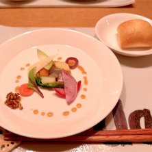 夕食 創作フレンチ、なのかな。季節柄山菜が多めで香りを楽しみました。盛り付けも凝ってて、美味しかったです。 ホテル自体が北欧の雰囲気で、使っている食器もiittalaやKAY BOJESENのものなどが多かったです。そしてドリンクはいつでも飲み放題…!