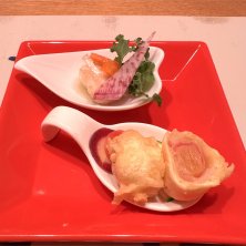 常磐産 鱸と根菜のエスカベッシュ 茨城 干し芋のパンチェッタ包みベニエ揚げ
