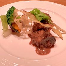 石川町 鈴木畜産より和牛ランプ肉のラグー 八丁牛蒡赤ワインソースをつけながら