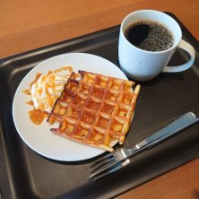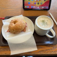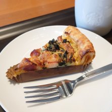 スタバでモーニング。 ベーコンとほうれん草のキッシュいたた”きました。 風があり肌寒いです。