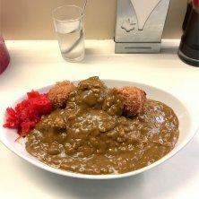 ライスカレーの店まんてんも、この状況下ですぐに入店できました。 熱々の揚げたてカツとシウマイフライをのせて。おなかいっぱい大満足です(ミニアイスコーヒー付き)