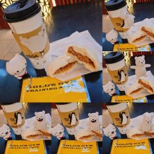 【お仕事前に】 間食 ・メガカフェラテ ホット・肉まん まだらん、通勤途中に羽田空港第3ターミナルで 降り、まだらん定番の場所とも言える、ここで 今朝のトレーニングを振り返り、メガカフェラテ のホットと肉まんに癒され、一休み中(*´ω`*) 今朝はやはりメガのホットだね(=^▽^)σ ホックホクの肉まんが美味しい季節到来🤗 あ!カップに書いてあるペンギンが、白熊を 投げ飛ばして、追い出した(σ≧▽≦)σ でも、肉まんのクッションで助かったね☝️ まだらん恒例のAI☝️みんな笑顔で🤗
