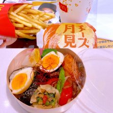 23日(祝)のランチ&晩ごはん♪ ☆マクドのチーズ月見バーガーのセット ☆ABCのごちそう中華DELI弁当 〜やみつき卵のぱっかんおにぎり、牛肉のオイスターソース炒め、ニラ饅頭、中華風鶏スペアリブ、大根のブルーベリー甘酢漬け、エッグタルト風デザート 最近少し気分が落ち気味だったので、 昨日はABCの料理教室に行ってきました♬ 昨日は、お持ち帰りもできる、中華風お弁当、 品数多いから、何をどう作ったかあんま覚えてないけど、美味しかったです(*´艸`*) 月見は今回は終わる前に食べれた〜☆彡