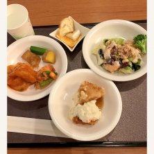本日の朝ごはんブュッフェ スクランブルエッグご飯🍚🥚 いくら 豚汁🐷 ミニトマト ほうれん草 蓮根グラタン 美人の素 昨日の嵐も去り、青空になりました 今日も長いけど頑張ろ!行って来ます