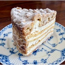 今日のデザートはユーハイムのフロッケンザーネトルテ(^_^) シュー生地に生クリームがサンドされています。上下はビスケット生地、外側のはアーモンドスライスが付いています。 甘さ控え目で、とても美味しいですよ(^-^)/