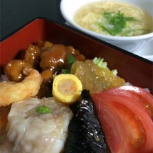 酢豚 クラゲ酢 海老天 など色々のったお重 。中華の宝石箱やぁ〜♪
