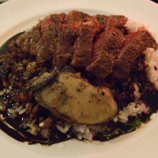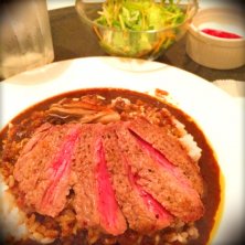 東京華麗探訪!中央区、銀座編 東銀座駅からSIX向かう裏通りのラーメン通りの こんな所にこんな店が雑居ビルの2Fに隠れ家的 魅惑の牡蠣と牛肉ステーキのせ黒いカレー 人気名店、牡蠣とステーキ「楸」初訪問! 牡蠣と牛肉ステーキのせ黒いカレー(肉100g)に、 瀞みある濃厚そうな、黒いカレーを口に運べば 濃厚でコク深く口当たり甘いがスパイス後から スパイシー濃厚な味良し欧風煮込み抜群絶妙旨! 濃い味だがあと口さっぱりな不思議なスパイス ステーキは焼き具合絶妙で柔らか味抜群絶妙旨!