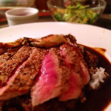 ステーキのせカレー(サラダ、デザート付き)。 ステーキのミディアムレアぶりにテンション上がりがちですが、盛り上がるのはそこじゃない! おまけに載ってる牡蠣のソテー、これだ!もう生牡蠣のように一気に頬張っていただきたい。牡蠣のエキスが口の中で流れ出し旨すぎ悶絶級だから。
