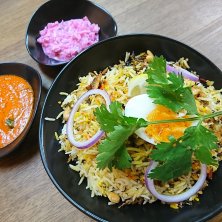 *チキンビリヤニ *玉ねぎとビーツのライタ *カシュナッツとピスタチオのソース ごはんの下に大きなチキンがゴロゴロ埋まってました〜😆 玉ねぎとビーツのヨーグルトサラダもさっぱりして美味しい❗️ソースはナッツなので濃厚〜✨ 美味しいランチいただきました☺️