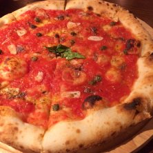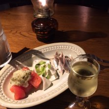 オンブラ(ハウスワイン)とイワシマリネ、カブと実山椒のマリネ、冷やしトマトのオニオンヴィネグレット(^。^) 先日行ったANTICA LOCANDAの3号店、まずはサッパリしたチケッティ(ヴェネツィアのバーカロで出てくるおつまみ)を頂きます( ^ω^ )