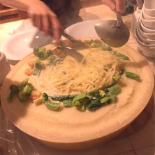 新鮮なパルミッジャーノ・レッジャーノに茹でたてパスタを直接のせて一気に絡めているところ❤️名物パスタ パルミッジャーノ・レッジャーノの良い香り