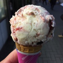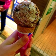 通りがかりにお店があったので、孫さんにご馳走になる。ウインターホワイトチョコレート・シングルコーン。あんまり甘くなくて美味しい。