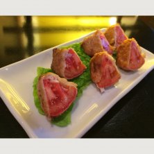 串フライの盛り合わせ 1人2本づつで、左からイカ、マグロ漬け、エビ、ウインナー、うずら、レンコン、椎茸 もちろん、岩塩でいただきました (^。^)