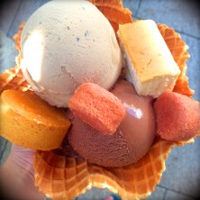 おやつ☆アイスクリーム☆ 最高のお天気!アイス日和です(*^^*) 3球で225元(2014.6)、頼んだのは、100%チョコ・フルーツティー・パイナップルヨーグルト。トッピング四種類まで無料、チーズケーキ2個・ワッフルクッキー・ドライクランベリーを選びました。さらにサービスでベリー入りクッキー♡盛り盛りです。周りの台湾人は基本1人1個オーダーしているけど、私は無理\(//∇//)\夏だ〜\(//∇//)\