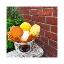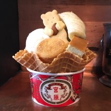 アイスクリームトリプルにチーズケーキとパイナップルケーキとバナナとクマクッキートッピング