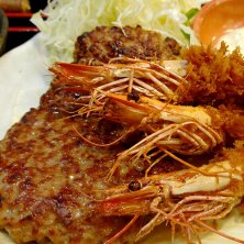 ハンバーグとエビフライ(3尾)1,650円 とりあえずハンバーグが2人前サイズ。海老も更にデカイです(^^; 3尾あるその奥までハンバーグがあるのが見えるだろうか。ドカ食いしたいときはココ。