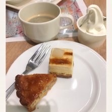 晩御飯ブュッフェのデザート 伊達牛乳使用ソフトクリーム🍦 洋梨とキャラメルのケーキ 4種の木の実のタルト お腹いっぱい ご馳走様でした❤️