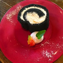 バスツアー、ランチを食べたら次は黒壁スクエア。 ガラス館や古い街並みを散策した後 バスに乗り込むまで15分という微妙な残り時間ではありましたが、散策前にチラ見したこのビジュアルソフトクリームを食べずに帰ったら後悔しそうだったので… 『黒赤をひとつ!』 と注文しました😆 黒はチョコレート 赤はイチゴ 美味しい😋 もっと味わって食べたかったけれど 暑さで溶けるのも早かったし (イートインとは名ばかりで、日差しある庭💦) 集合時間も迫っていたので急いで食べました。