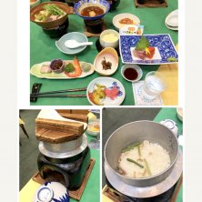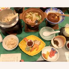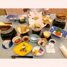 豪華な晩御飯♪♪♪ 山菜釜飯 天ぷら かぼちゃ、アスパラ、阿寒湖名物ワカサギ 石狩鍋 お刺身 茶碗蒸し あさりの甘露煮 手羽元の煮物 焼き魚とまりも団子 お腹いっぱい… ロビーのウェルカムソフトクリームに間に合わなかった…😭 ソフトクリーム食べ放題なのに🍦 20時で終了でした…残念。
