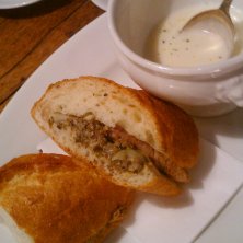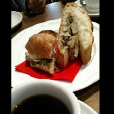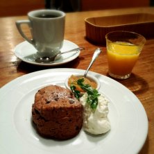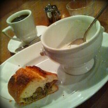 朝ごはん モーニングのサンドイッチセット サンドイッチは焼いたバゲットにパテと薄切りじゃがいも、タプナードっぽいけど酸味のある何かがが挟んであってボリュームあり! スープはビシソワーズ コーヒーはエチオピア フルーティで酸味のあるコーヒーでした