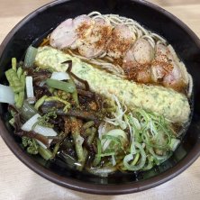 鴨蕎麦、山菜、ネギ、ちくわ天。乗り換えの合間に。いただきまーす。