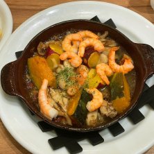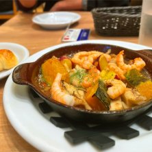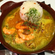 メインは海老とほうれん草のカレー☆ ピリ辛で美味しい〜。 パンにも合いますね♪( ´▽`)。