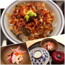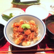 天丼 締めはいつも天丼 天茶も、ばら天丼もいいけど、やっぱり天丼 今回は季節の生の実山椒を少したたいて香りをだしたものを、隠し味にご飯にまぶしていただきました(^_-) そしておろしたての山葵がまた味を奥行きを作ってくれます