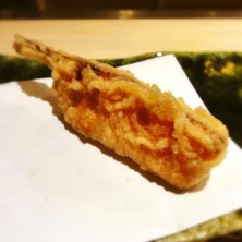 くえ 天ぷらの油で、片面だけ火を入れています 油の温度は低めのため、ゆるやかに熱が入って、食感と甘みが増しています 火を使わないのでいわゆる炙りの香りもなく 蒸す訳ではないので身が乾くわけでもなく 天ぷら屋ならではですね 他ではあまり見ませんですが