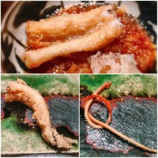 穴子 不漁の中、久しぶりによいものが入ったので とお出しいただきました こちらは三河の小ぶりなサイズのものを使われています 身の方は天つゆでたっぷりにおろしとともに 尾の方は塩で 骨は骨せんべいにして