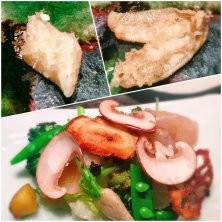 アオリイカ、きす、お口直しのサラダ しっとりとしたアオリイカ さっくりとした鱚 サラダには、様々な朝採れ野菜と、様々な魚が、様々なテクスチャで