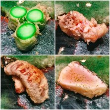 アスパラ(根元)、甘鯛の松笠、椎茸、鰆 香りの濃いアスパラ 食感が絶妙な甘鯛の松笠 美味しい水分がいっぱいな椎茸 レアな火入れが素敵な鰆