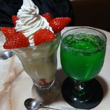 有名 純喫茶店☕リバーストーンで一休み。コーラは売り切れ。ソーダ水?メロン🍈ソーダ アイス抜きとの事。イチゴ🍓パフェを食べました(爆)(@^^)/~~~😋🍴💕人気店(@^^)/~~~ですので、売り切れの商品も多かったですね(爆)2F の一番奥の席に陣取ります。吹き抜けのある、開放感がある造りになっております。イチゴパフェ😋🍴💕美味しいです😆🎵🎵