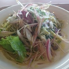 「ワサビと山菜のパスタ」 昨日のオープンカーのイベントで御岳ロープウェイの山頂駅の展望レストランでいただきました。 このてのレストランのメニューは残念なことが多いのですが、これはおいしかった。ワサビもほどよく効いてますし、ミョウガ、シメジなどの野菜もたっぷり入ってて、とても良かった。 残念なことは、レストランが混んでて(自分達が一気に入ったのが悪い)、料理が運ばれるまでに時間がかかり、集合時間が迫って、ゆっくり食べれなかったこと。 いつか、再チャレンジしたいです。