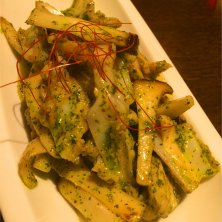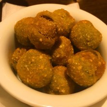 グリーンオリーブの肉詰めフライ これ大好き♡ ここだかどこだかは忘れましたが、同じお料理のことを店のマスターが 「チマチマ手間ばっかかかるくせに、儲からないひと品」 と嘆いていた(笑)