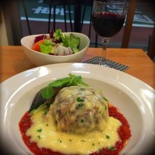 和風ハンバーグステーキ マッシュポテト添え ¥980 にマッチングワインのキャンティ ベリーニ(イタリア)を付けて このマッチングワインはなんとプラス¥100で頂けます(^^) 2015.10.02