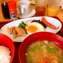 いつものジョイフルのモーニング。 目玉焼き朝食にクーポンの唐揚げひとつ(^^)