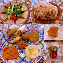 旦那さまとアメリカ人の友人と広尾でディナー(^^) 生レモンローズ、ミント、タマリンドジュースで乾杯。 前菜盛り合わせ、ケバブ盛り合わせ、ファラフェル2種、ナン2種、フリーカのチキンピラフ、デザート盛り合わせ、菊茶、ミントティー、アラビアコーヒー。 昔話、近況報告。楽器や音楽ソフトのオタクネタ。仕事や今後のビジョン、住まいなど真面目な話し。数年振りに会ったけど、変わらず楽しい仲間。 友人は徒歩で私たちはタクシーで帰宅。 楽しすぎて食べすぎた〜。