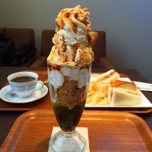 美味しいと評判のカフェへ。 大きな大きな、黒蜜きな粉パフェ❤︎ …食べる前に、パフッて音を立てて、落ちました笑