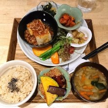 39品目の健康定食+車麩(のカツ) メインはすき焼き風あんかけ揚げ出し豆腐(ちょっとうろ覚え) お野菜メインの定食?カフェ それなりのお値段なのでコスパはいいとはいえませんが、野菜メインでもわりと満足できる味と内容でした。