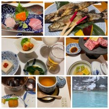 初めての白骨温泉♨️ 夕膳は突出しから始まりお造り、煮物、焼物、揚物の温泉粥コロッケはすごくトロトロ、強肴など 地元の食材もふんだんに美味しくいただきました😊 こちらは白濁の大露天風呂♨️源泉かけ流しが人気があるようで何度も入ることができてよかったです!