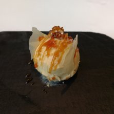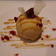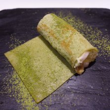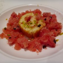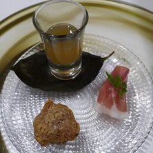 ぶどうのジュース、イチジクを揚げたもの、生ハムでゆずを加えたマスカルポーネを包んだもの。