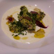 鮎を丸ごと骨ごとくだいてパン粉あげにしたものとヴィシソワーズ。