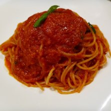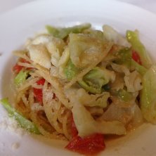 春キャベツ、ミニトマト、アンチョビソースにチーズをかけたオイルベースのパスタ。