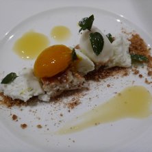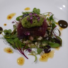 戻りカツオに鮎の魚醤をかけたもの。 下に敷いた大麦と落花生の食感がいい感じ。