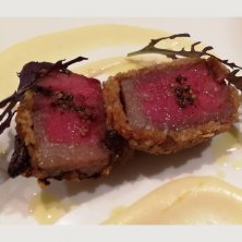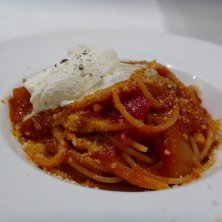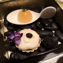 トマトのグミ、ヨーグルトのタルト、炭パウダーでくるんだサルシッチャ