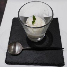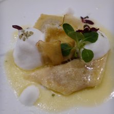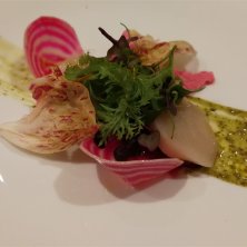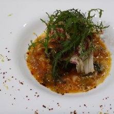 軽く燻製したホタテ貝とキウイにワサビを混ぜたソース