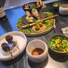 クラフタル(1/3) 目黒川の桜並木にひっそりと佇むフランス料理店 ライトモダンなインテリアにBGMはクラシック…少しチグハグだがはたして 「パンペアリング」と言う料理毎に小さなパンがついてくる新しい試み 【前菜】 *鹿肉と根菜のサラダ *揚げたてのビーフシチューパン(パンペアリング) ジビエの蝦夷鹿を低温でじっくり 前菜からテンション上がる パンがとても美味しい たぶん冷めても美味しい 内田にも食べさせたい *アミューズ ホタテとブラウンマッシュルームとフォワグラの前菜は割愛します