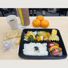 集まりでお弁当🍱とみかん 人気店ですが冷たいのは残念😢 メンバーさんから温かいスープやお菓子の差し入れ ありがとうございます❤️