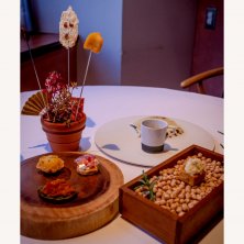 久しぶりのConvivio スッポン出汁の小さなスープ チーズとアーモンドのオーブン焼き ごぼうのマリネ シナノゴールドのカラメリーゼ 山椒クッキークリームチーズ 苺 サンブーカのゼリー 金柑塩麴のムース 花型の器 カポナータのクロスティーニ バッカラマンテカート パネッレ