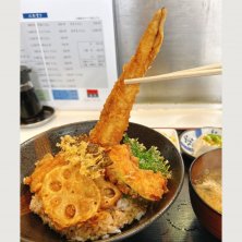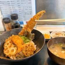 出勤前に月1回「鶴天」へ 😃 いつもの 穴子天丼+レンコン(¥1,250) 揚げたてあつあつ美味かった〜 😋